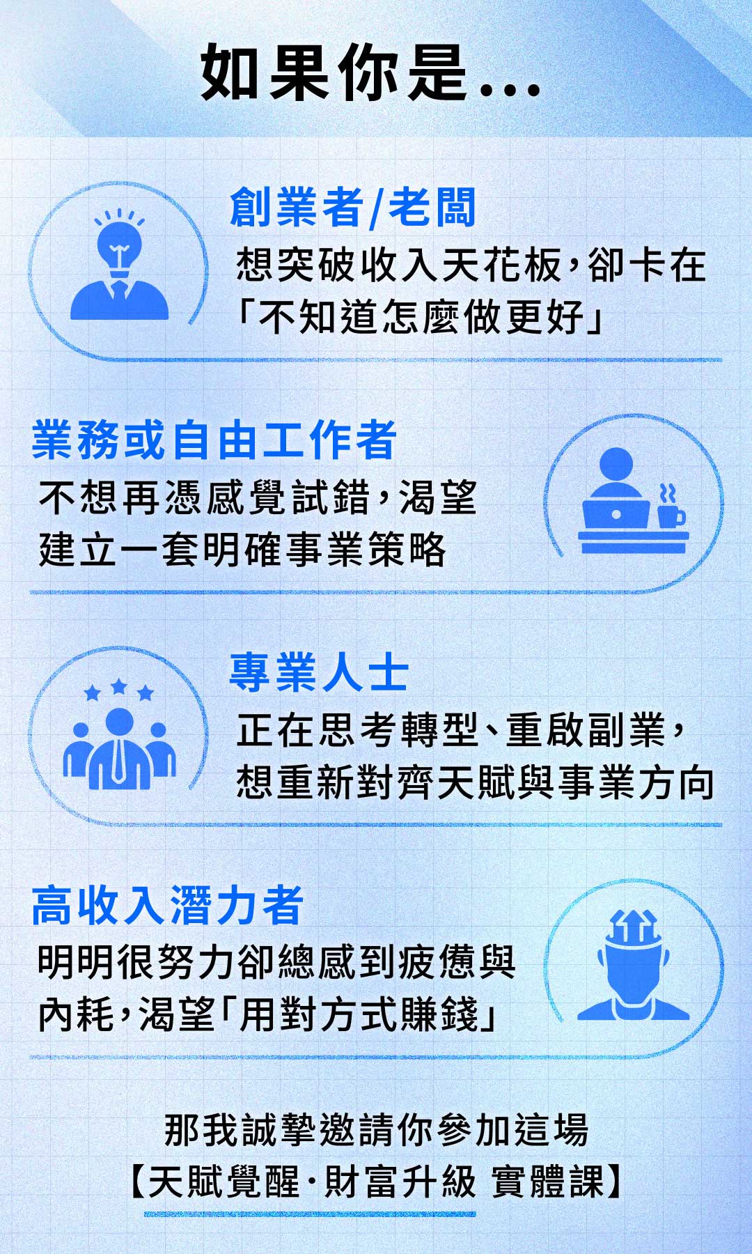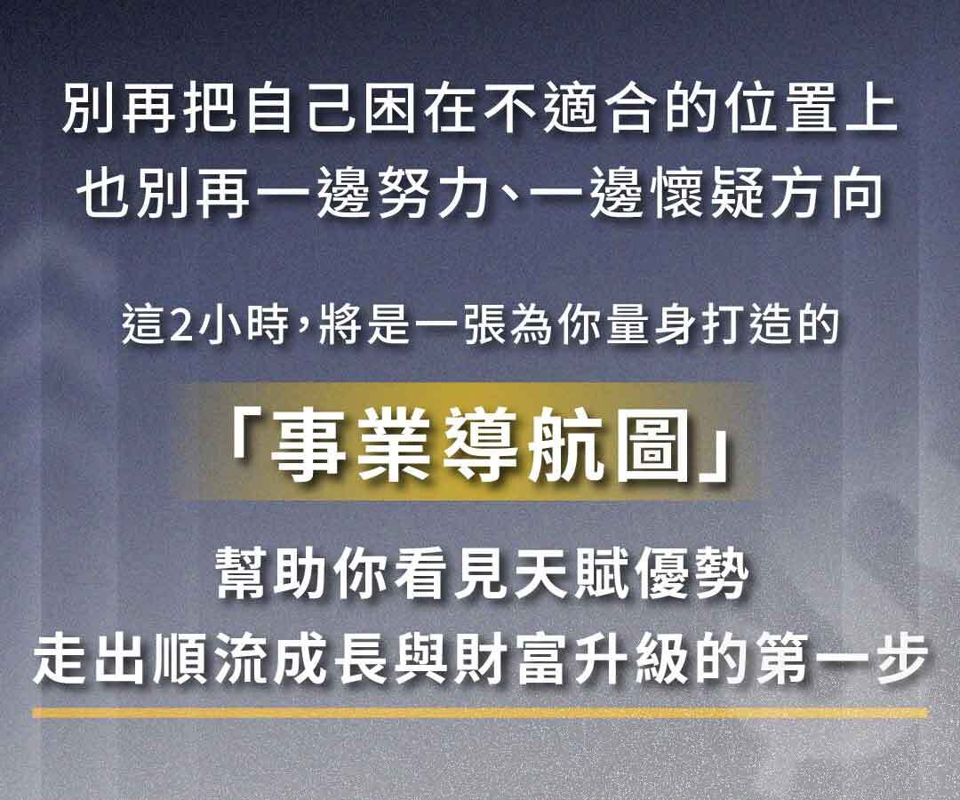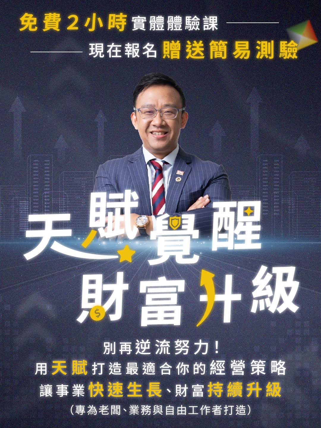 成功從來都不是靠努力,而是懂自己! 這場 2 小時的課程,將帶你了解如何透過天賦測驗、財富光譜與燈塔模型,找出最適合你的獲利方式,打造事業與財富的升級路徑。特別適合創業者、業務人員、自媒體經營者與想轉職的上班族參加。