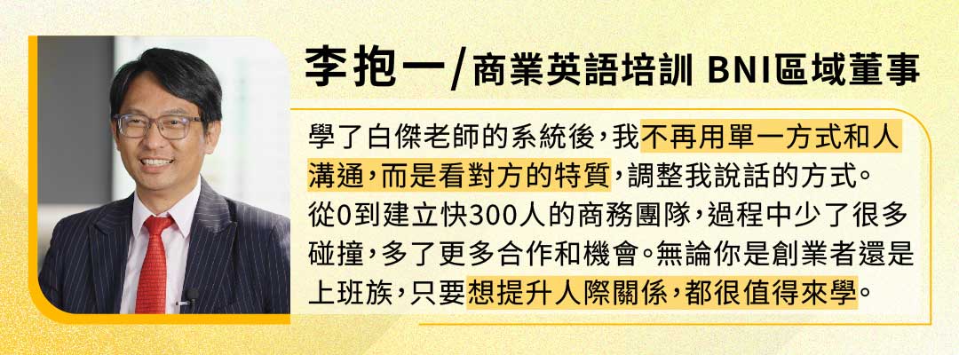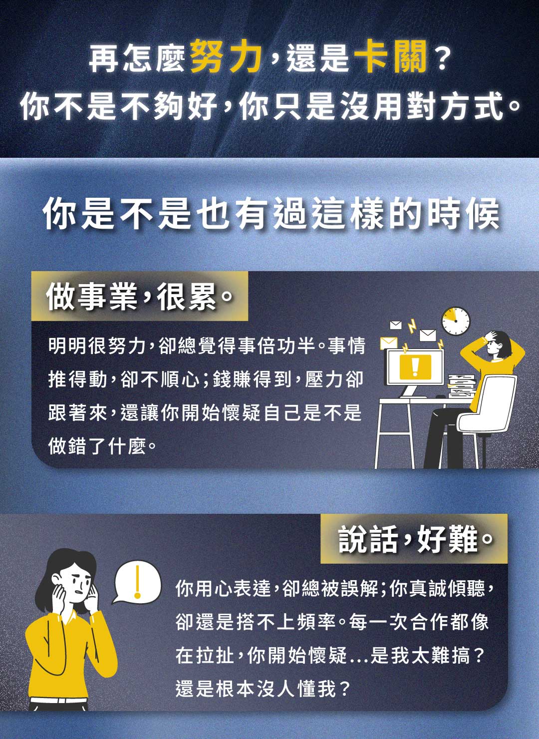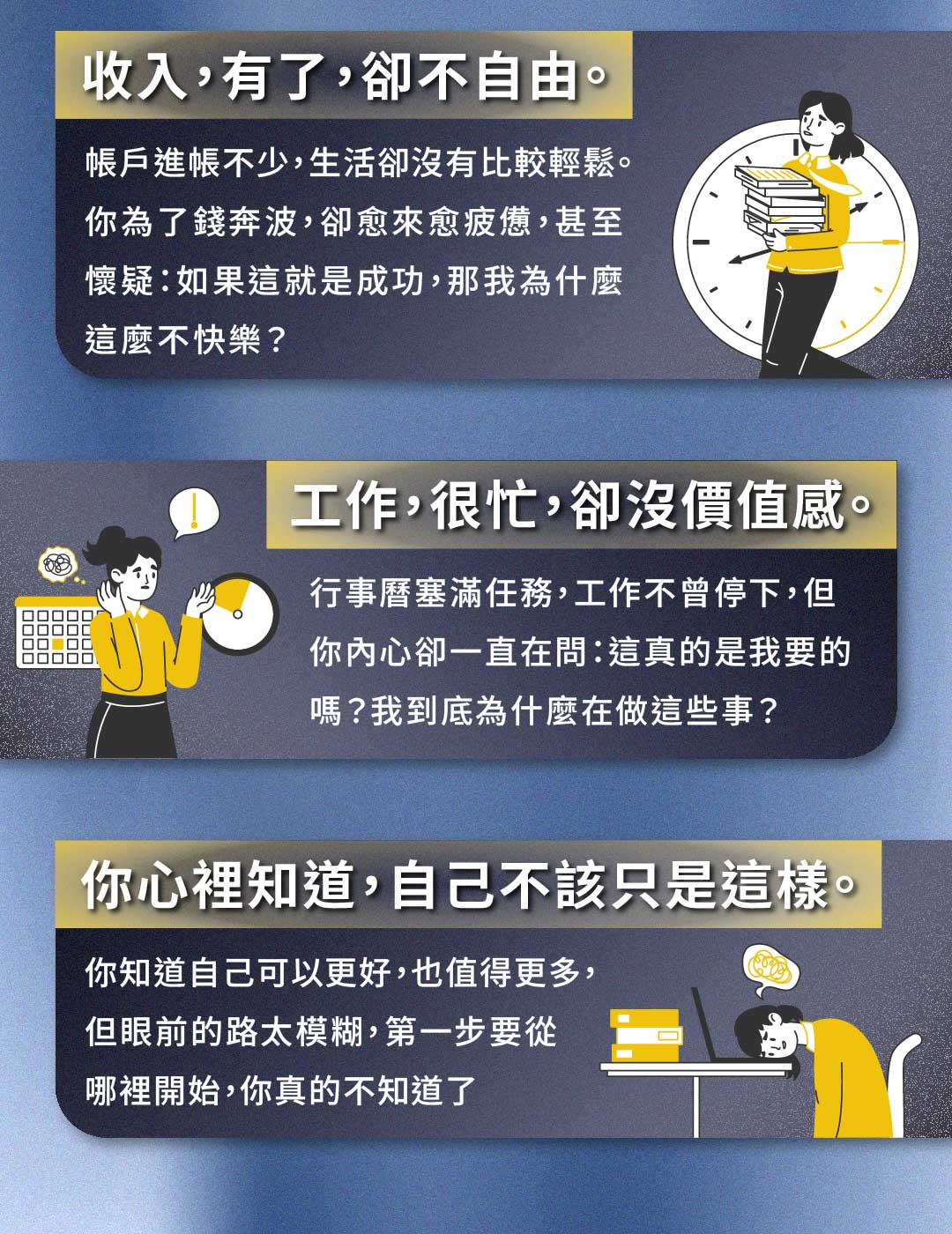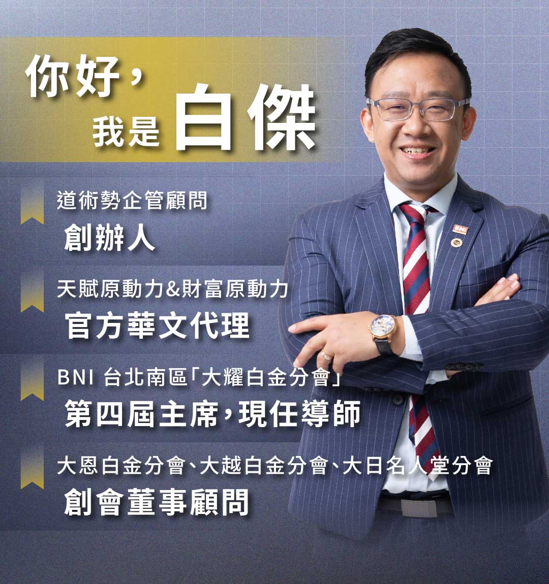 成功從來都不是靠努力,而是懂自己! 這場 2 小時的課程,將帶你了解如何透過天賦測驗、財富光譜與燈塔模型,找出最適合你的獲利方式,打造事業與財富的升級路徑。特別適合創業者、業務人員、自媒體經營者與想轉職的上班族參加。